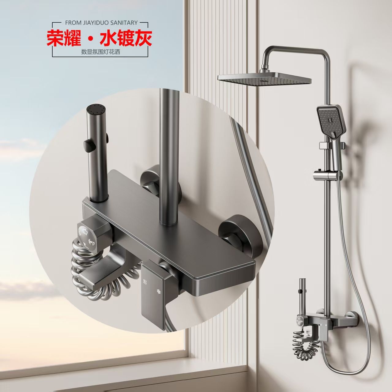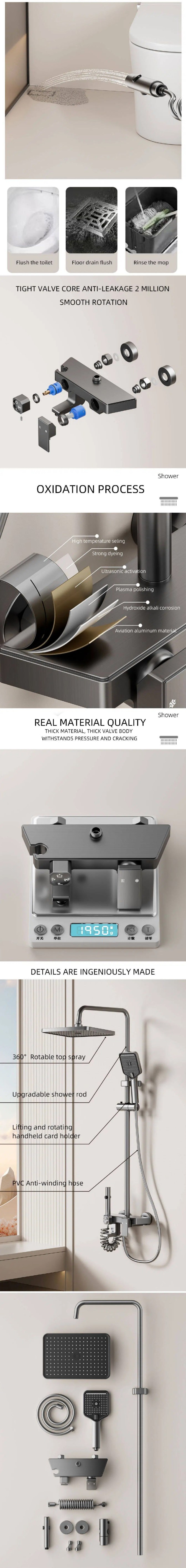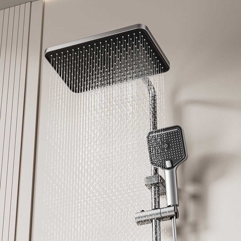 This aluminum bathroom shower set includes a rainfall shower head and handheld shower. Lightweight, rustproof, durable and easy to install. It provides comfortable shower experience for home and hotel bathrooms.
