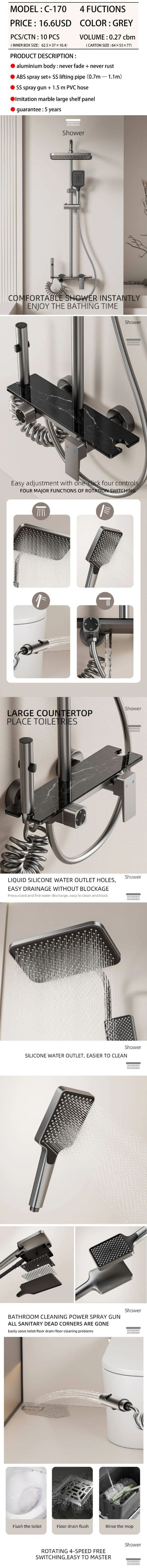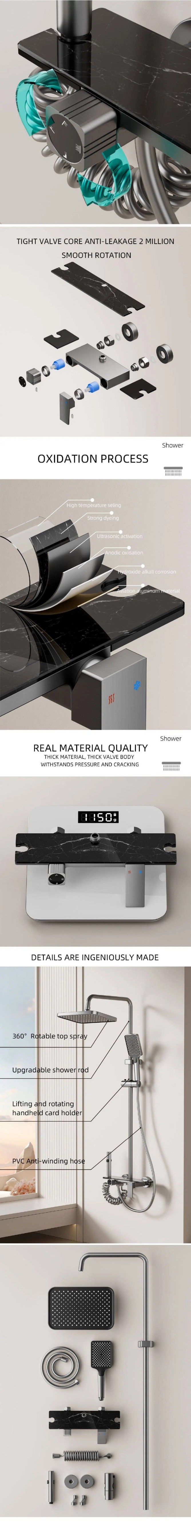 This aluminum shower set features a digital display light and 4-function rainfall shower. It is made of durable aluminum, rust-proof and easy to clean. The 4 water modes meet different bathing needs, while the digital display shows real-time status clearly. Simple to install and ideal for household bathrooms.