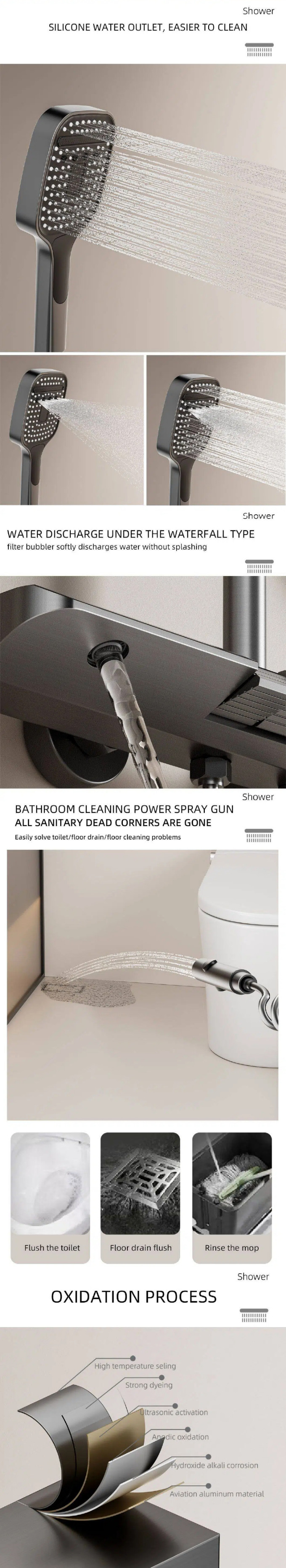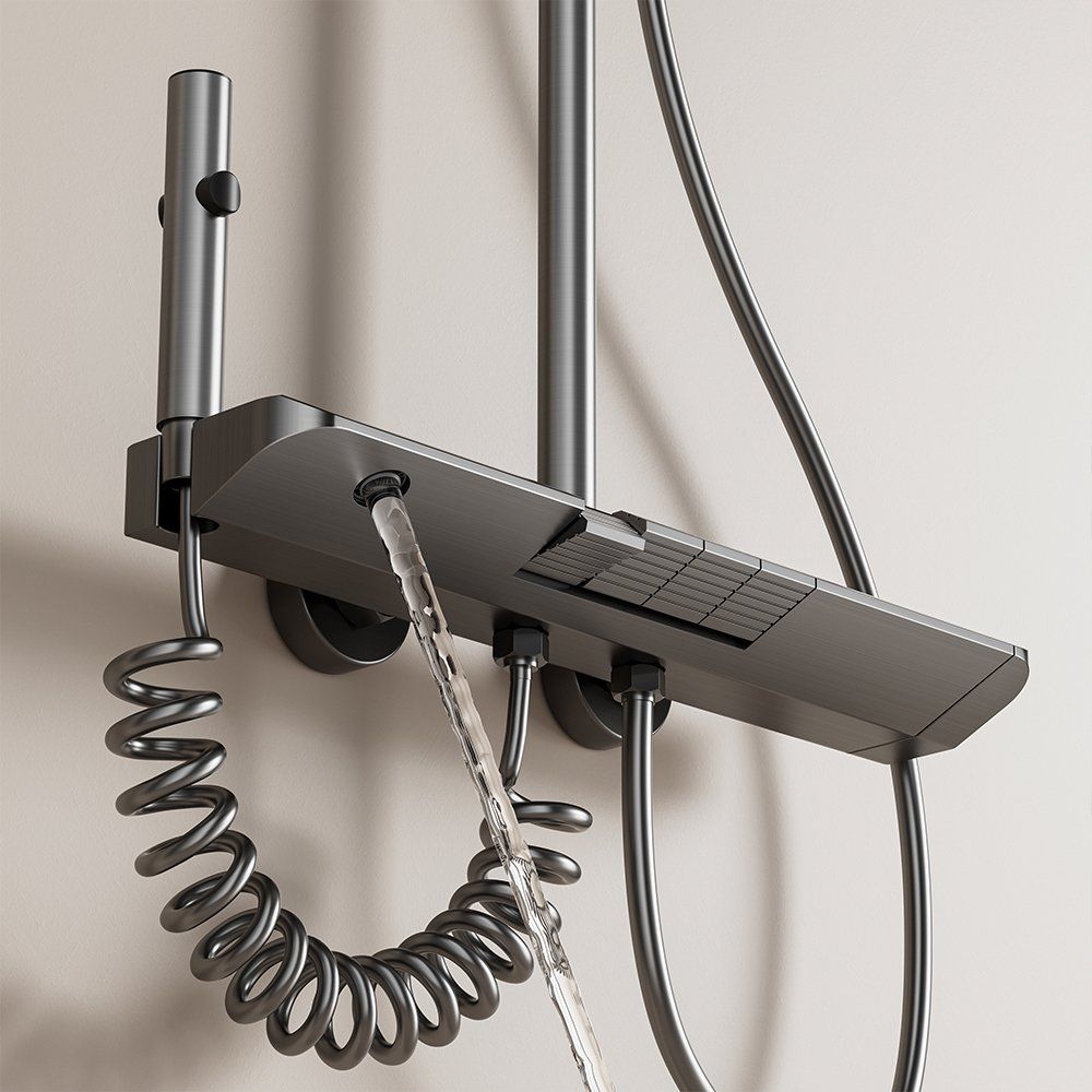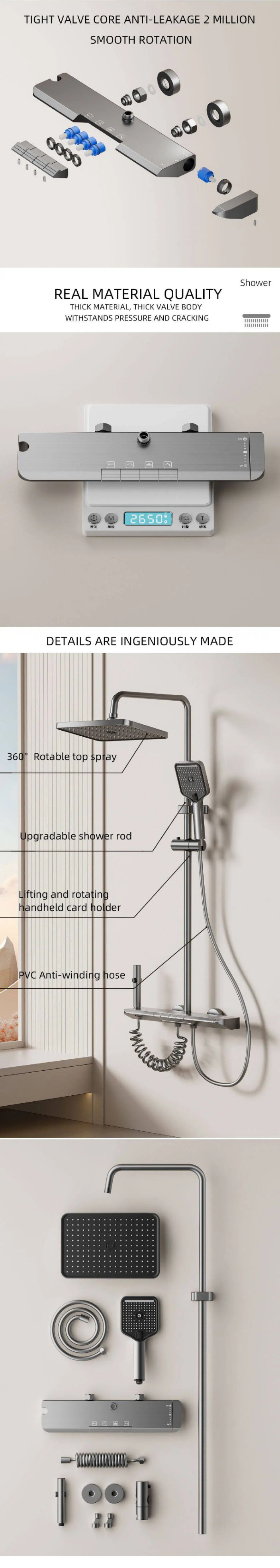 This premium shower set features a durable aluminum body, precise thermostatic control, digital temperature display, piano-key control panel, LED ambient light, and self-powered hydroelectric system. It offers stable, safe, and comfortable showering with a modern, luxurious design. As a professional Chinese manufacturer, we provide reliable quality, easy installation, and OEM/ODM service for global buyers.