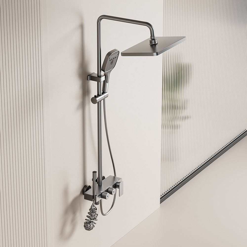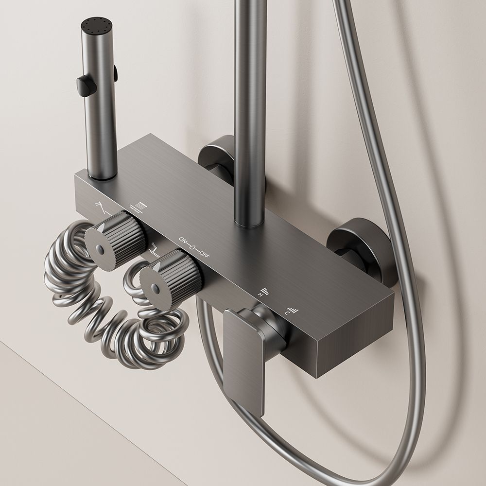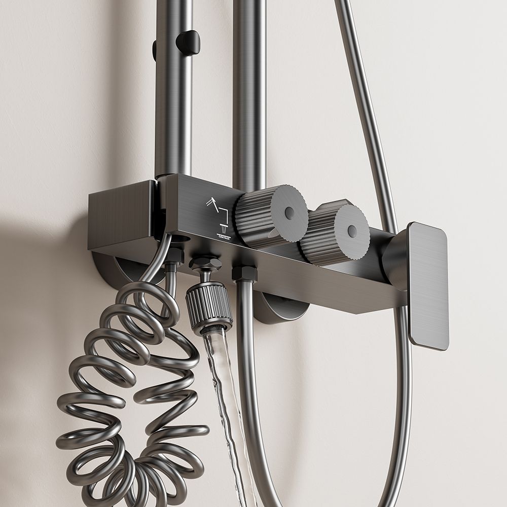 Contemporary exposed shower faucet system with dual handle, featuring a rain shower and mixer. Sleek design, easy temperature/water control, easy installation, suitable for modern bathrooms.