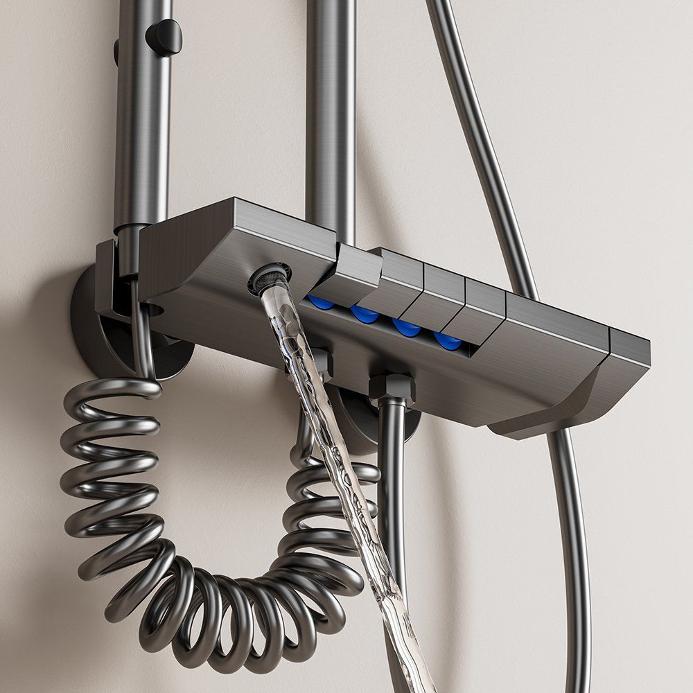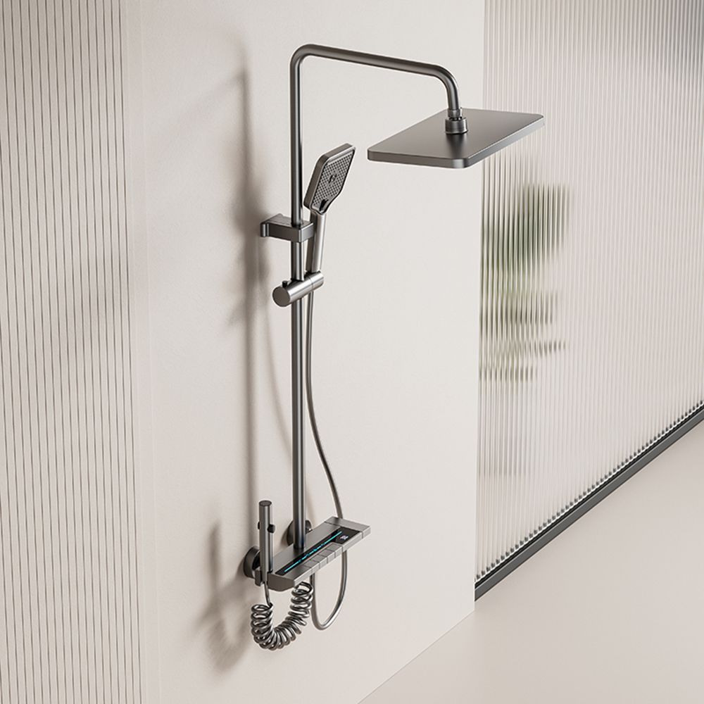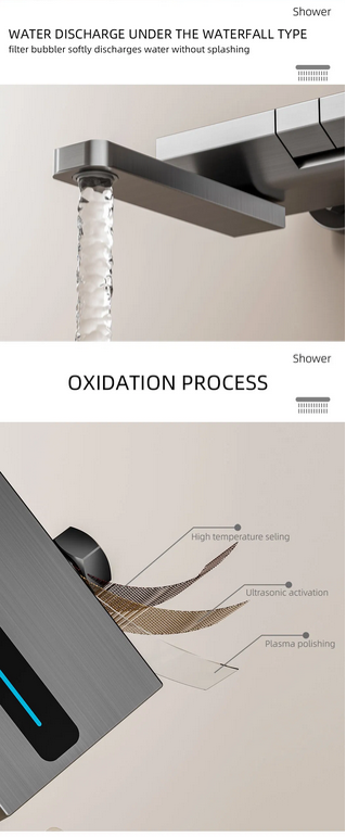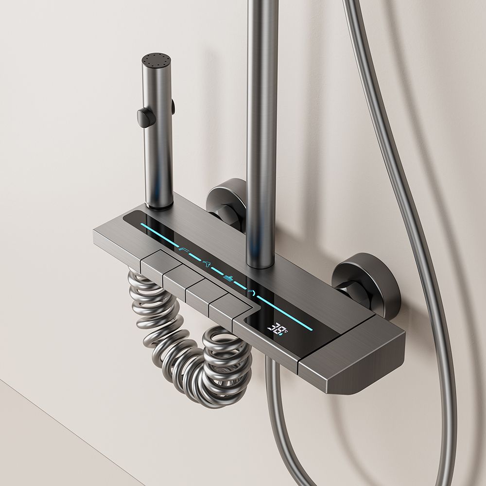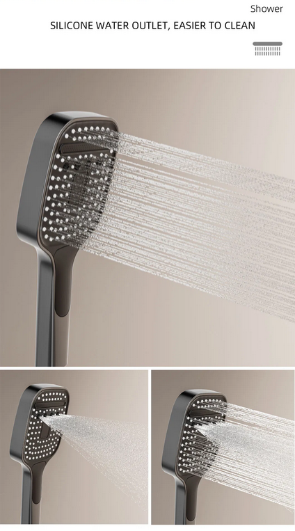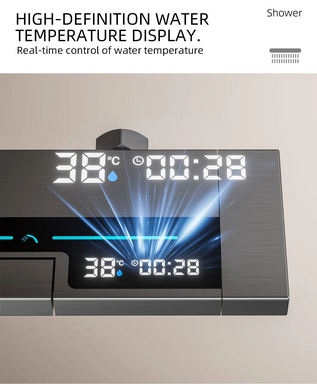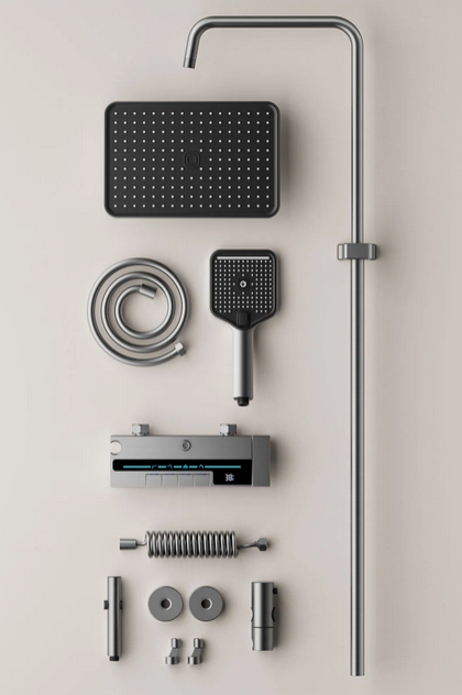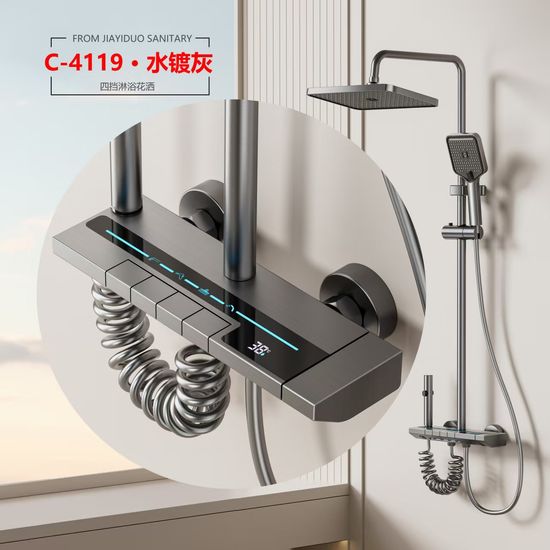 Modern and minimalist gray shower set, equipped with a clear digital temperature display that allows real-time water temperature checking to avoid scalding. It has 4 practical water outlet modes (rainfall, powerful jet, soft mist, bathtub spout), supports free adjustment of hot and cold water, and meets various needs of daily washing and bathing. The overall material is durable, corrosion-resistant and not easy to rust, with simple and easy-to-understand installation steps. It is suitable for all types of shower stalls and bathtubs, balancing aesthetic appearance and practical performance, and easily enhancing the bathroom texture.