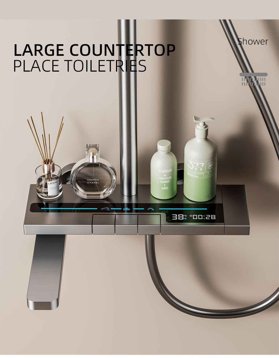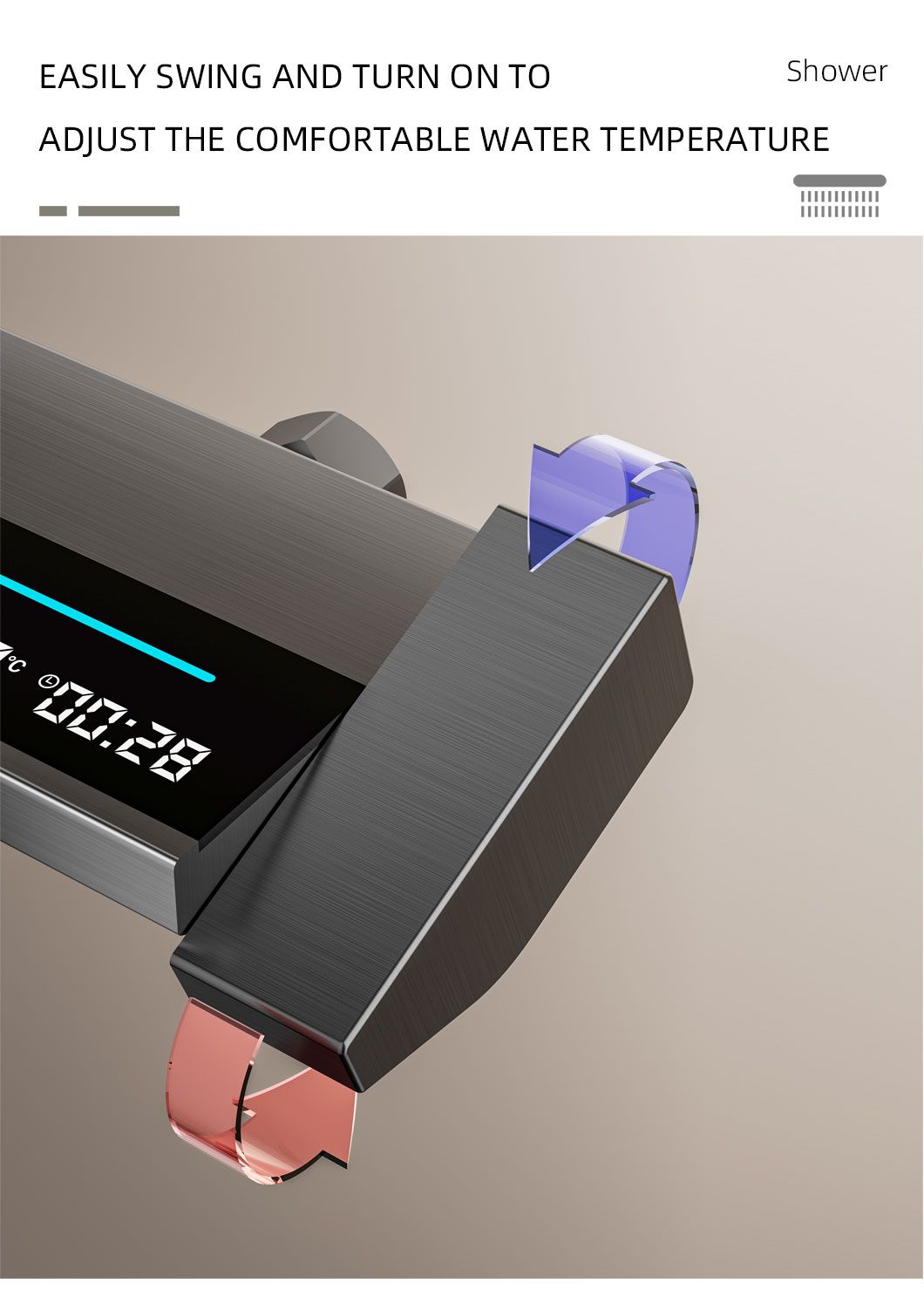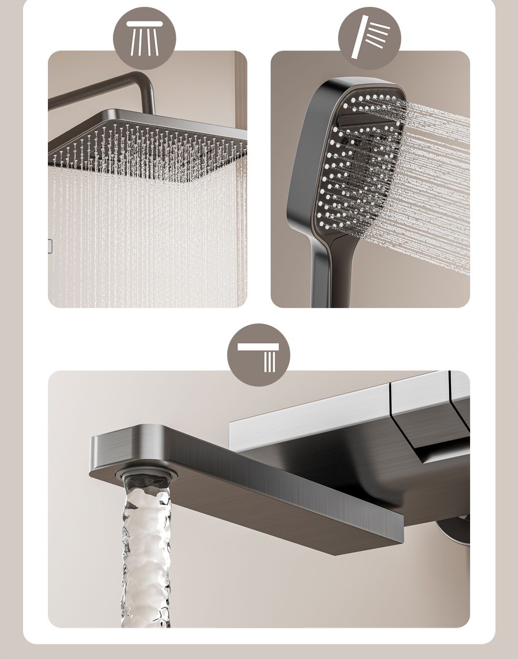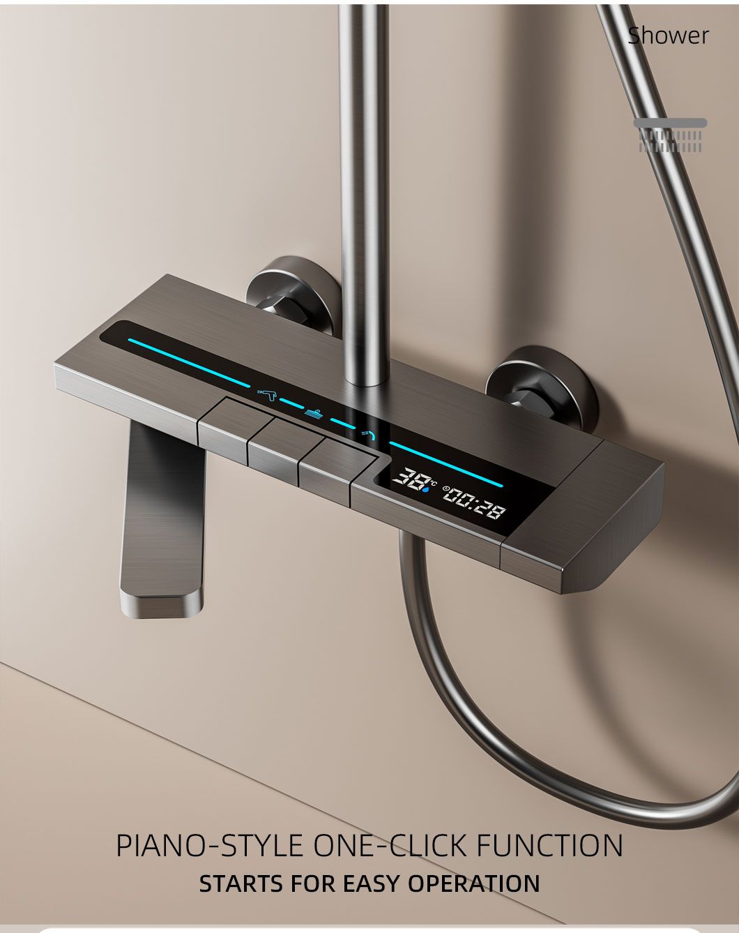 Modern and minimalist gray shower set, equipped with a clear digital temperature display that allows real-time water temperature checking to avoid scalding. It has 4 practical water outlet modes (rainfall, powerful jet, soft mist, bathtub spout), supports free adjustment of hot and cold water, and meets various needs of daily washing and bathing. The overall material is durable, corrosion-resistant and not easy to rust, with simple and easy-to-understand installation steps. It is suitable for all types of shower stalls and bathtubs, balancing aesthetic appearance and practical performance, and easily enhancing the bathroom texture.