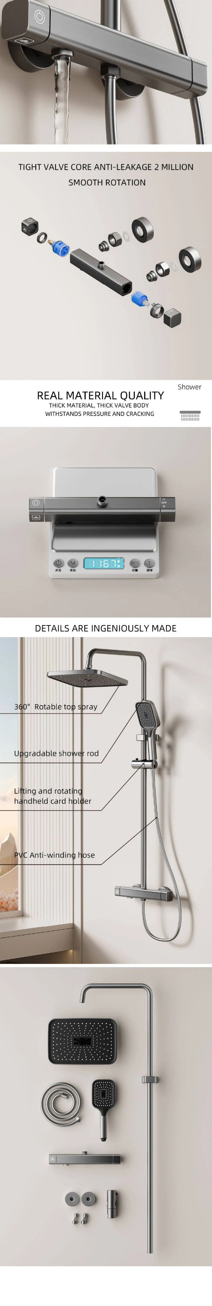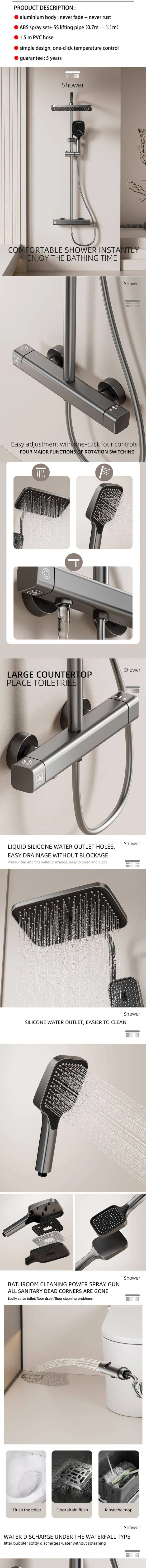 This gun grey piano shower system combines modern design with reliable performance. It features a piano key control mixer for easy hot and cold water adjustment, a waterfall tap, and a rainfall shower head. The stylish gun grey finish is rust-resistant and easy to clean, making it perfect for modern bathrooms. Easy to install and operate, it brings a comfortable and luxurious shower experience.