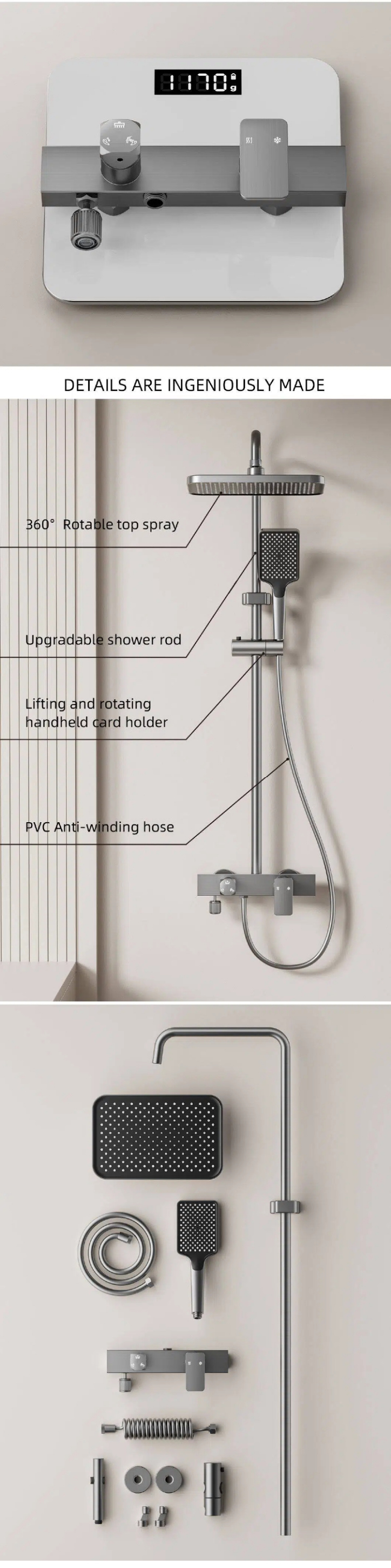 This premium shower set delivers a spa-like bathing experience with three versatile water functions, including a luxurious rainfall shower. Designed for high-end bathrooms, it blends elegant aesthetics, durable construction, and precise control to elevate your daily routine.